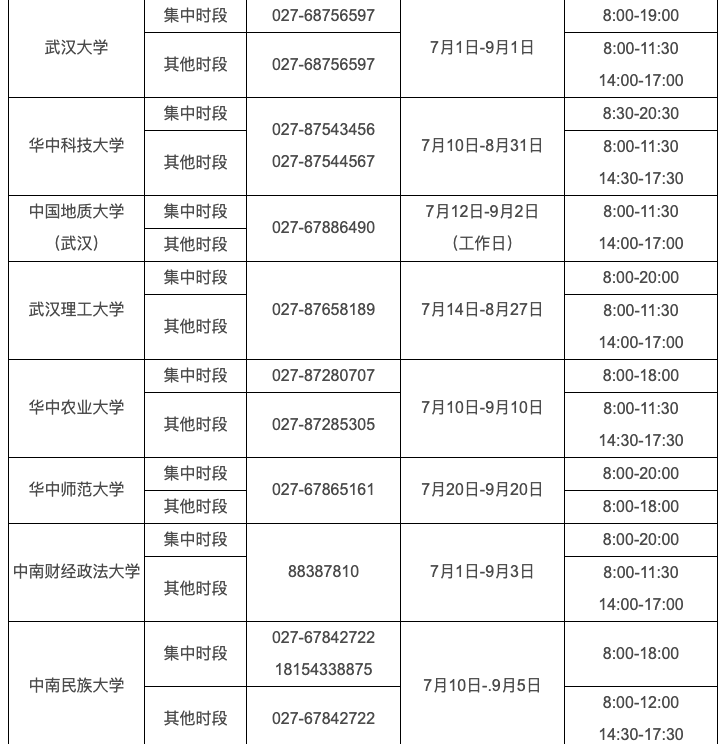 教育部网站还公布了武汉大学、华中科技大学、中国地质大学(武汉)、武汉理工大学、华中农业大学、华中师范大学、中南财经政法大学、中南民族大学等在汉部属高校的热线电话。